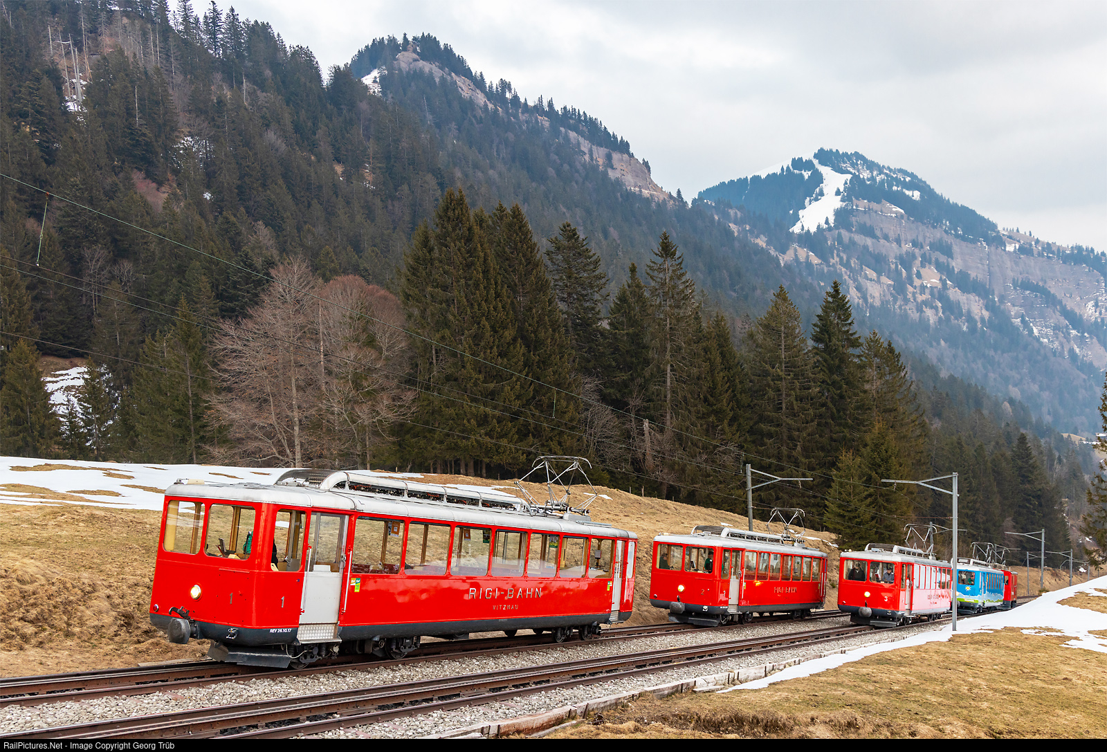 Farewell parade for the Rigi Bahnen cogwheel railcar Bhe 2/4 # 3 built 1937 on its last working day between Romiti Felsentor and Rigi Kaltbad-First. From left to right the two motor coaches # 1 and # 2, also built in 1937, the motor coach # 3 on its last day of service, the Bhe 2/4 # 4 with the publicity paint scheme for Migros, built in 1953, and the locomotive He 2/2 # 18, built in 1938.