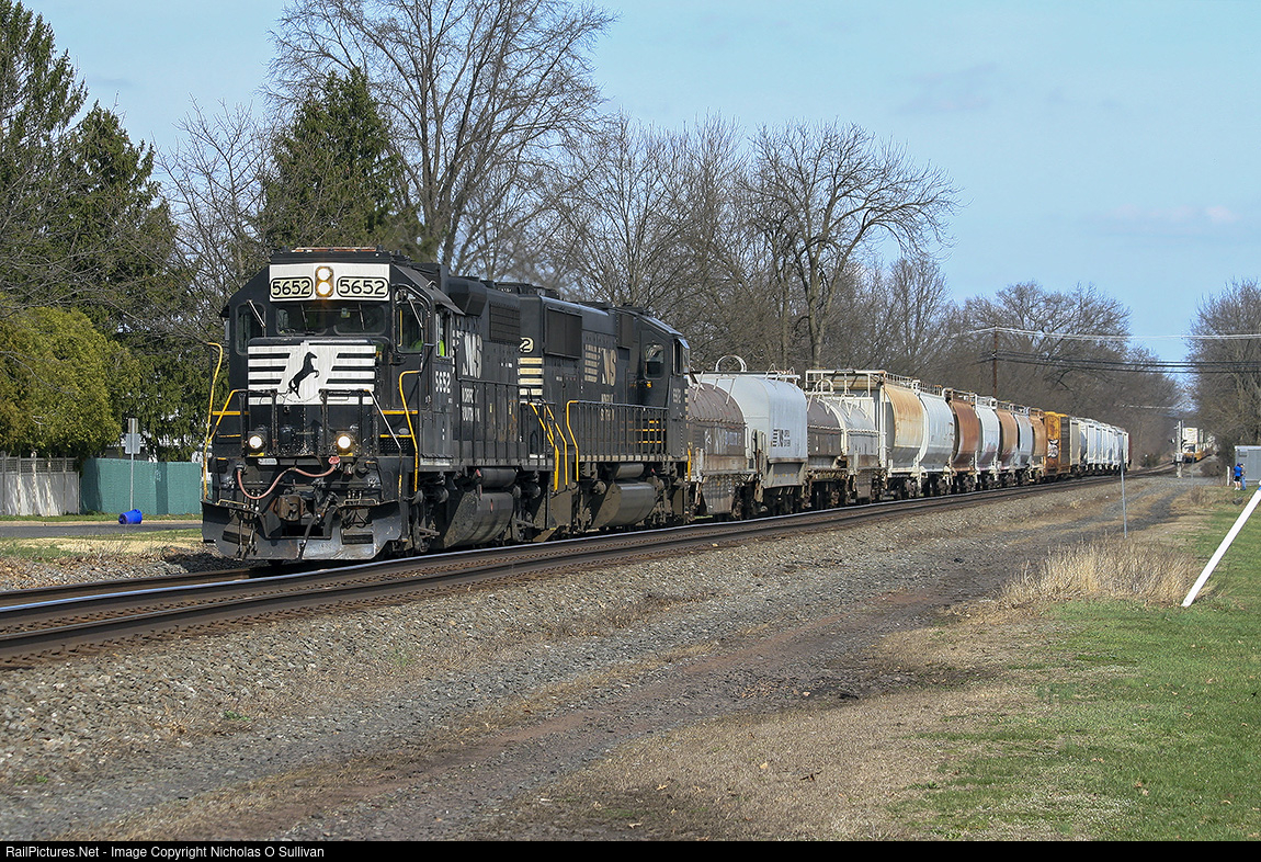 | On a warm March day, NS H76 heads west back to Allentown Yard on Norfolk Southern Lehigh Line Track #1 after serving Manville Yard. Behind the leader is NS 6972 (SD60E). The rear end NS 20K can be seen in the distance on Track #2. The leader was originally built as a GP38 for Penn Central as PC 7870, which went to Conrail as CR 7870, and then to Norfolk Southern as NS 2924. It was rebuilt into a GP38-2 as NS 5652 by Norfolk Southern in July of 2006. The trailing unit was rebuilt from SD60 NS 6605 in January of 2015. |