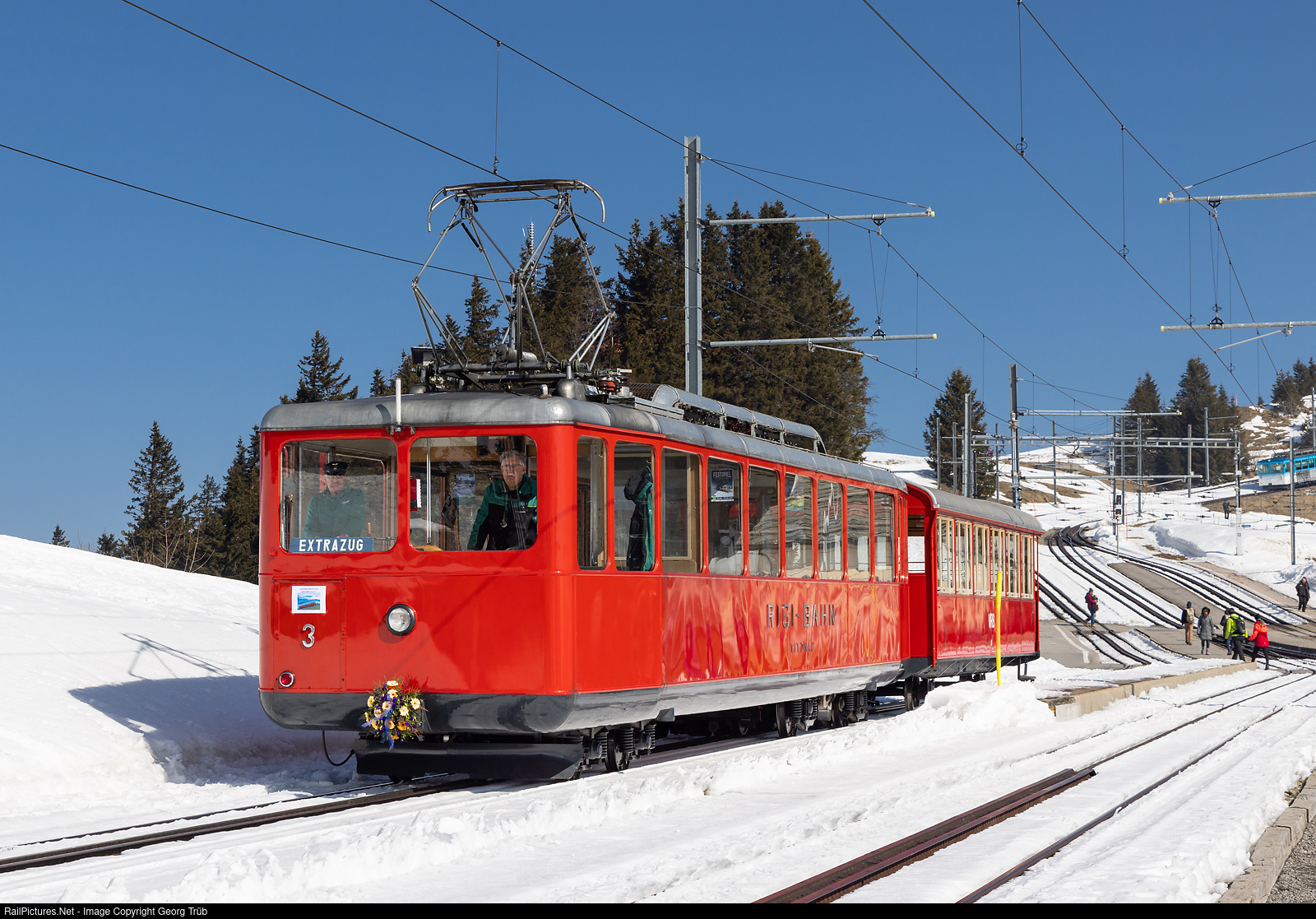 | On the very last day of operation, cogwheel railcar (by the staff called "Motorwagen" = motorcoach) Bhe 2/4 # 3 of the Rigibahnen, built in 1937 for the Rigi Bahn (RB) is running a substitute train to CC 1122. Car B # 16 of 1925 will withdrwan soon, too. |