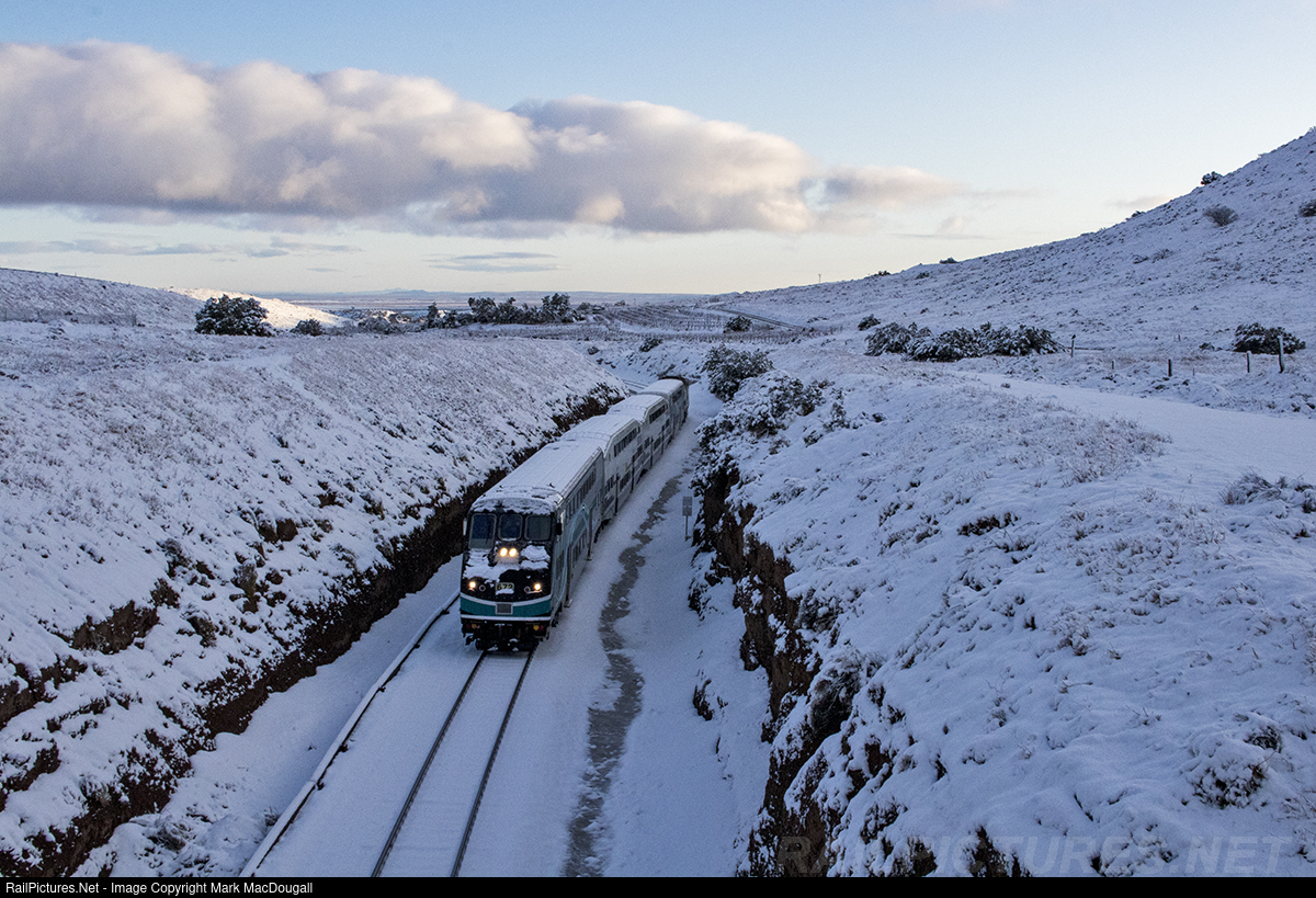 Metrolink 208 nears the summit at Vincent with a cab car experiencing very rare snowy weather for this region.