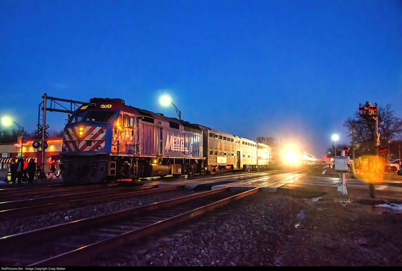 As Metra train 1253 (with METX F40PHM-2 200 for power) makes a stop at the BNSF Line’s Harlem Avenue Station, Metra train 1255 (behind F40PHM-2 192) speeds through the station on its way to Aurora. Both trains are headed to Aurora, but various trains make different stops en route. (Berwyn, Illinois – January 14, 2016)