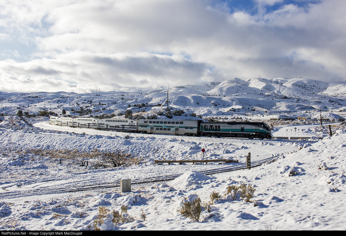 Metrolink 201 heads into the Antelope Valley on a snowy winter morning.