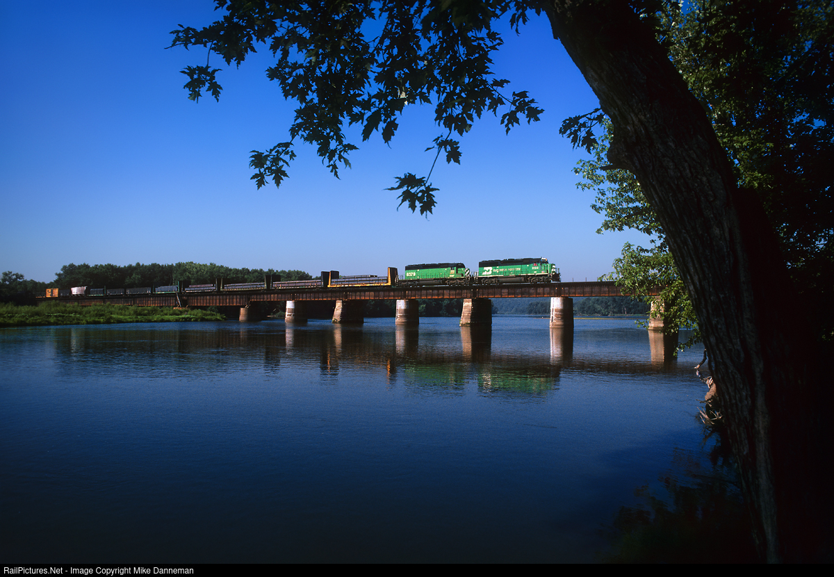 Burlington Northern train 143 marches westbound over the Wisconsin River Bridge near Prairie du Chien at Crawford, Wisconsin, on the warm morning of July 30, 1995.