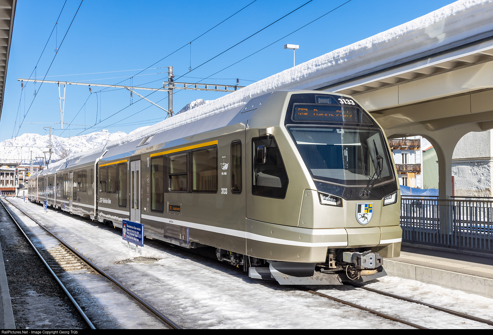 "Capricorn" ABe 4/16 # 3133 of the Rhaetian Railway with the name "Piz Palü" got a special paint scheme in "champagne" color, to celebrate the 500th carbody livered from Altenrhein to the RhB by FFA (Flug- und Fahrzeugwerke Altenrhein), Schindler Waggon and StadlerRail. The train is standing in Davos Platz, to run a regional train to Klosters Platz.