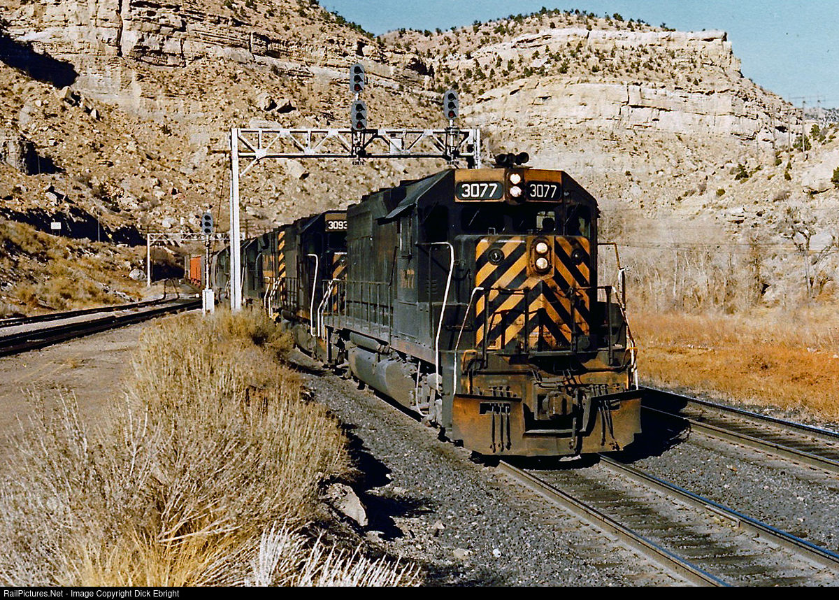 | D&RGW #3077 is eastbound, in your face, at Utah Ry. Junction at the lower end of Price River Canyon. Helper Yard is about 3 miles or so ahead. Those tracks on the left are the yard leads to Utah Ry’s Martin Yard. A lot of changes in this area since I took this shot in 1980. For example, those two signal bridges are long gone. The far left Utah Ry. yard lead track has been pulled up for years. Scanned from a color print. |