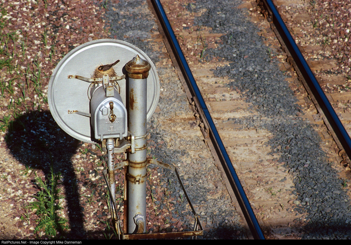 Taking up residence behind the background of a Union Switch and Signal Company searchlight signal on the Soo Line’s westbound main line at Pewaukee, Wisconsin, is an American Robin sitting on her nest of eggs on June 11, 1991.