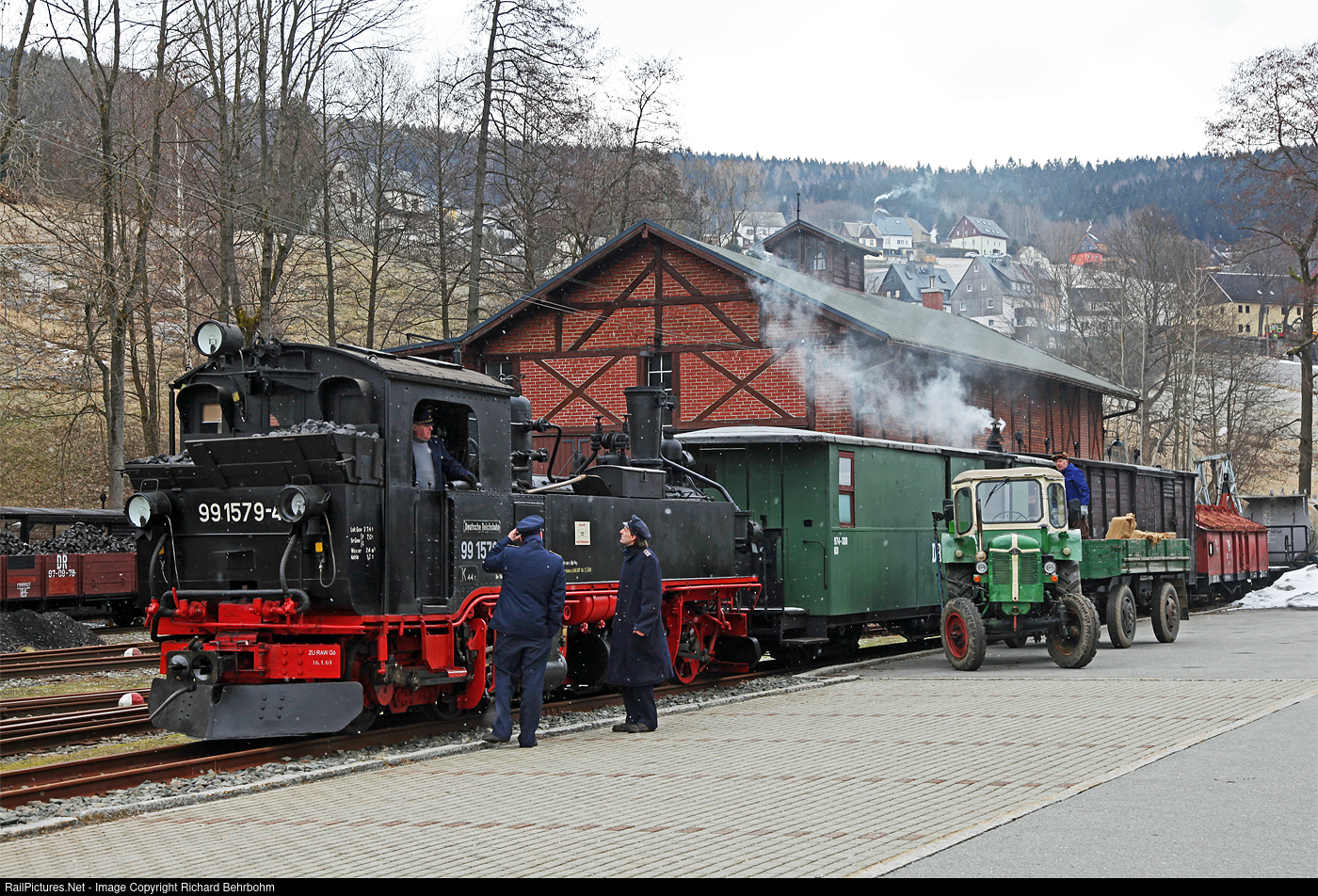 | Photo event "1971 - a day at Rittersgrün station" in the railroad museum Rittersgrün. The 750mm gauge line Grünstädtel – Oberrittersgrün was closed in 1971. Today, the Saxon Narrow Gauge Railway Museum Rittersgrün is located at the terminus station. The Saxon IV K locomotive 99 1579 was built in 1912, it is not working. |