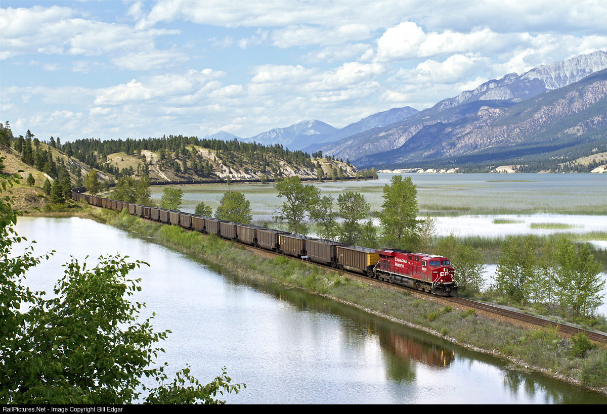 | CP 8828 crosses a causeway just north of Canal Flats along Columbia Lake with an empty coal train headed toward Ft. Steele. At Canal Flats the CP line will continue south along the Kooteney River. The Columbia River flows north out of Columbia Lake, while the Kooteney flows south with Canal Flats sitting on high ground that separates the flow of these waters. |
