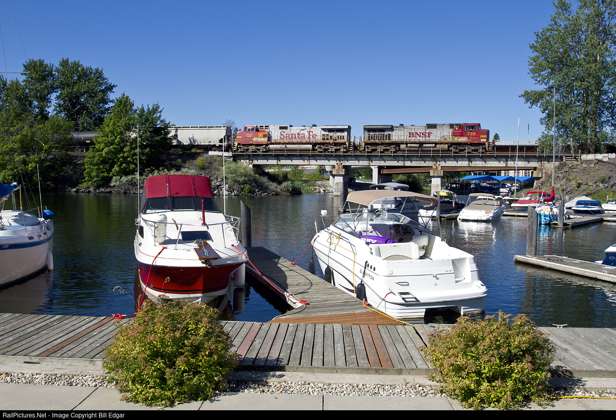 | BNSF 738 leads a freight northward through Sandpoint at the marina on the shore of Lake Pend Oreille. Vintage ATSF Dash 9, BNSF 622, trails still wearing its 19 year old original Santa Fe colors with apologizes for the orange air conditioner. The unit was built in February 1994 as ATSF 622. |