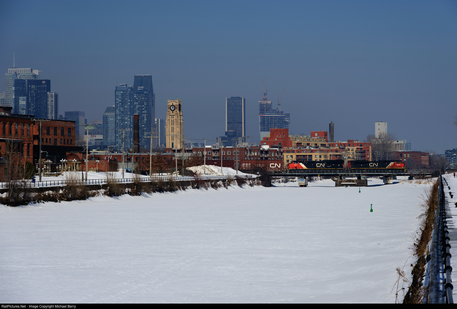| CN 324 is crossing the Lachine Canal with CN 8017 & CN 3077 for power. A CN noodle is visible on the first car and the power, as well as in the far distance at left, on CN's headquarters building. |