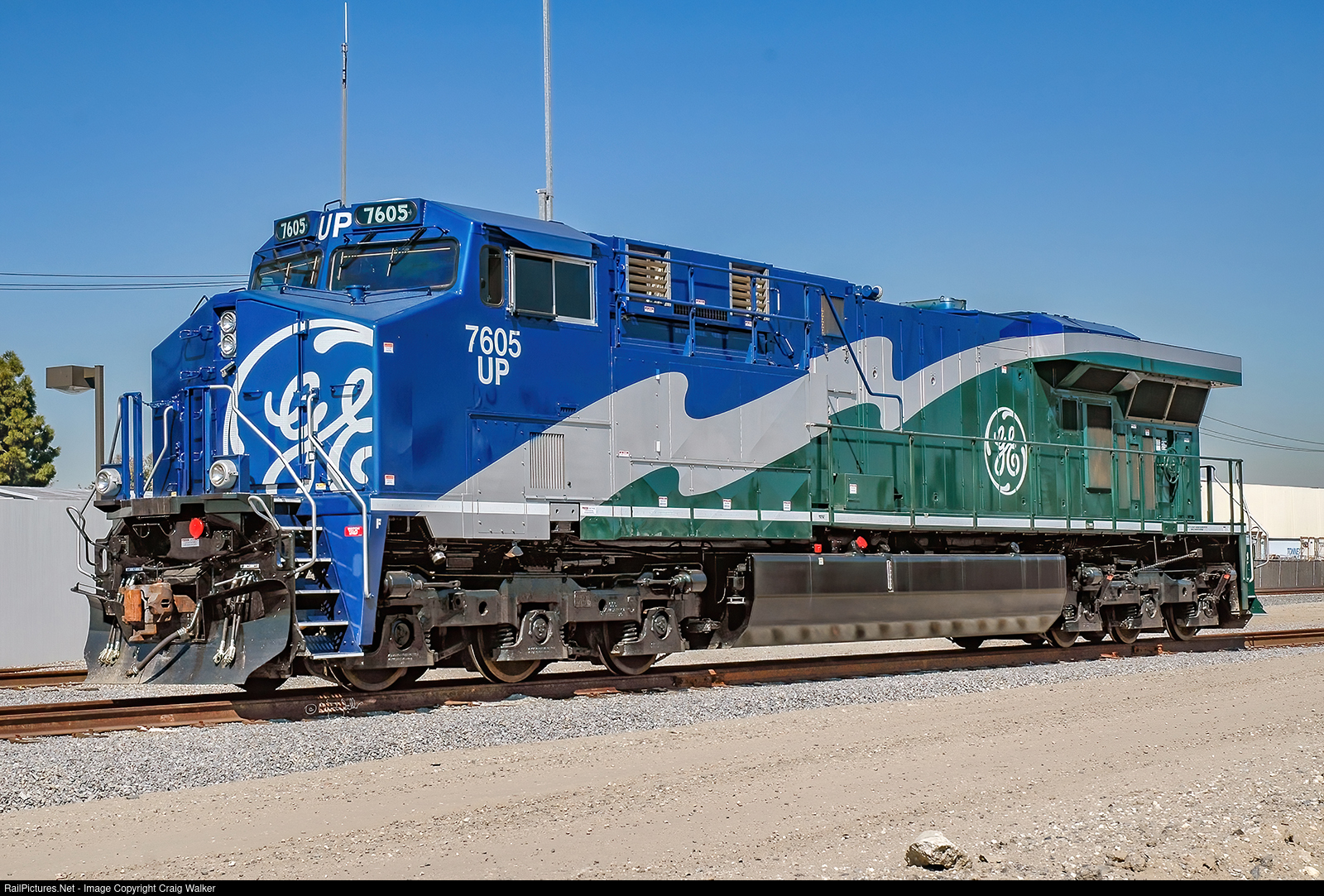 Sitting near Union Pacific’s Dolores Yard is UP ES44AC 7605, painted for General Electric to promote the builder’s Green Locomotive technology. This locomotive is still on UP’s roster, but was repainted into UP’s standard Armour Yellow and Harbor Mist Gray paint scheme. (Compton, California – March 1, 2007)