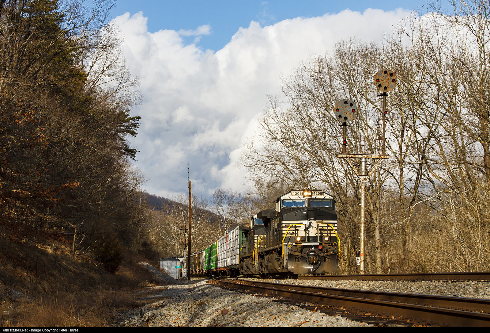 | You'd never know this day dawned with a snowstorm...11Z rolls towards Roanoke in nice sunlight, passing the N&W CPLs guarding Glasgow. |