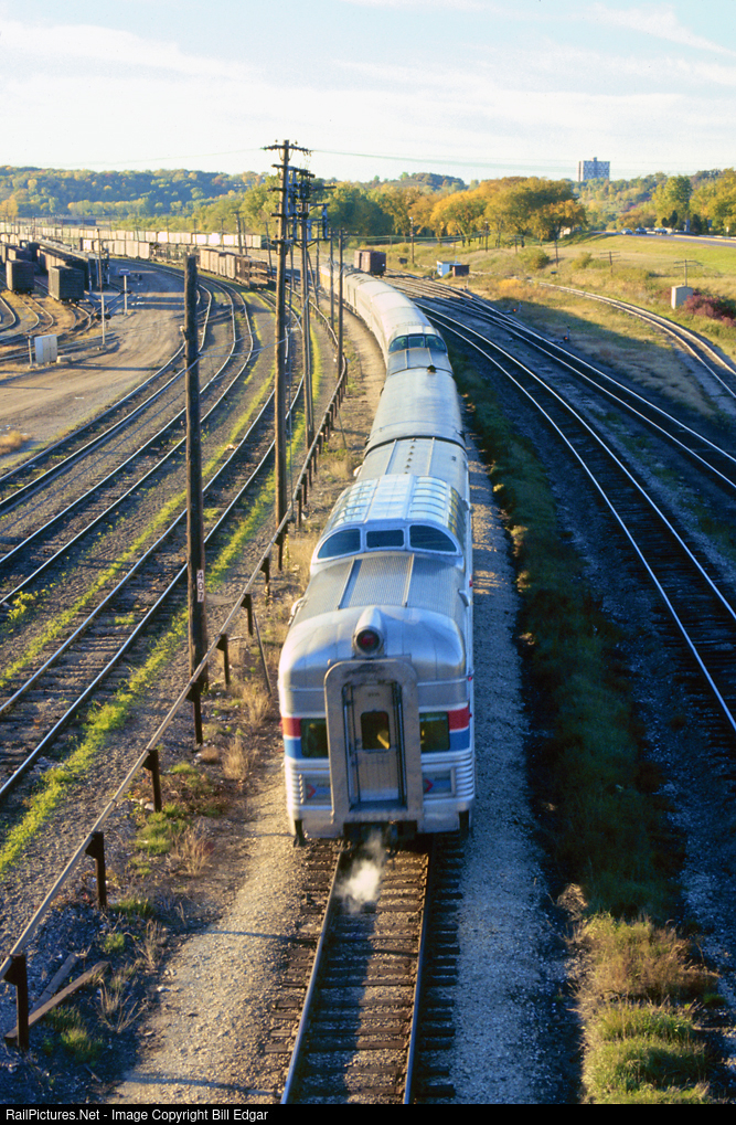Amtrak train 17, the North Coast Hiawatha races toward St. Paul between Milwaukee Road's Pigs Eye Yard and BN's Dayton's Bluff yard. One of Amtrak's nicer efforts, the train featured a dome coach, diner, sleeper, and in this case a former Denver Zephyr dome observation car. It was routed to Seattle via NP trackage to Spokane, then GN via Stevens Pass.