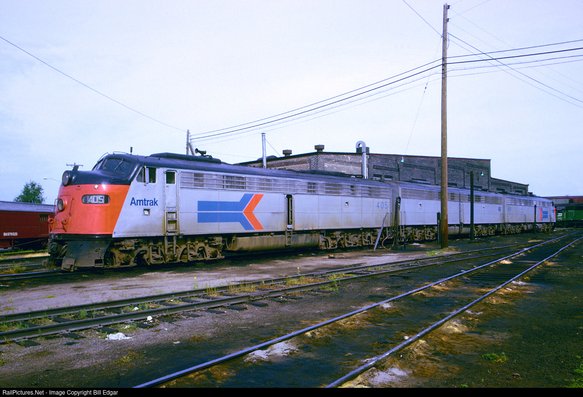 Amtrak E9s 405, 451, and 406 await their next run at BN's Harrison St. shops in July 1973. The units were acquired from Milwaukee Road and assigned to the North Coast Hiawatha. They were MILW 30A, 34B, & 30C. 30A & C were built in February 1956, 34B in April 1956. They were delivered to MILW in UP colors.