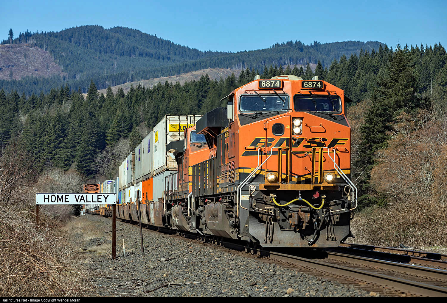 | A hot intermodal train bisects Home Valley, Washington. It is in the heart of the Columbia River Gorge on BNSF's Fallbridge Subdivision. |