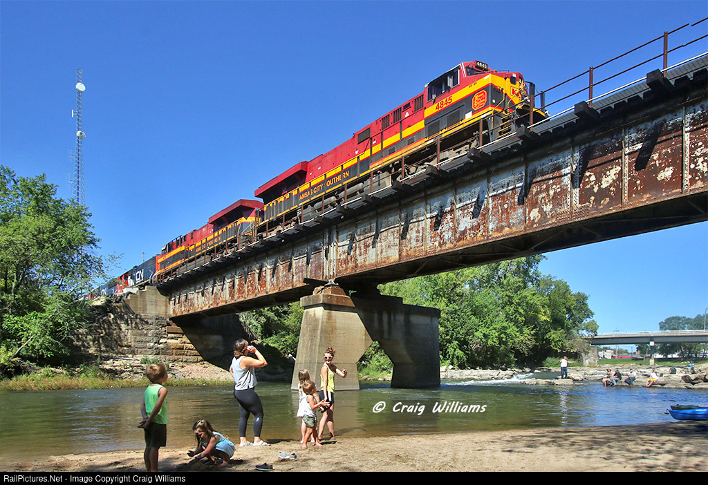 | CN had high hopes that scenes like this in Iowa might be a common thing, but that won't be the case. KCS power had been coming to Iowa alot in later 2021. Here 338 sets out Cedar Rapids loading at Manchester to the north siding. As they do their work off the east end, the Maquoketa River is full of people enjoying the beautiful day. |