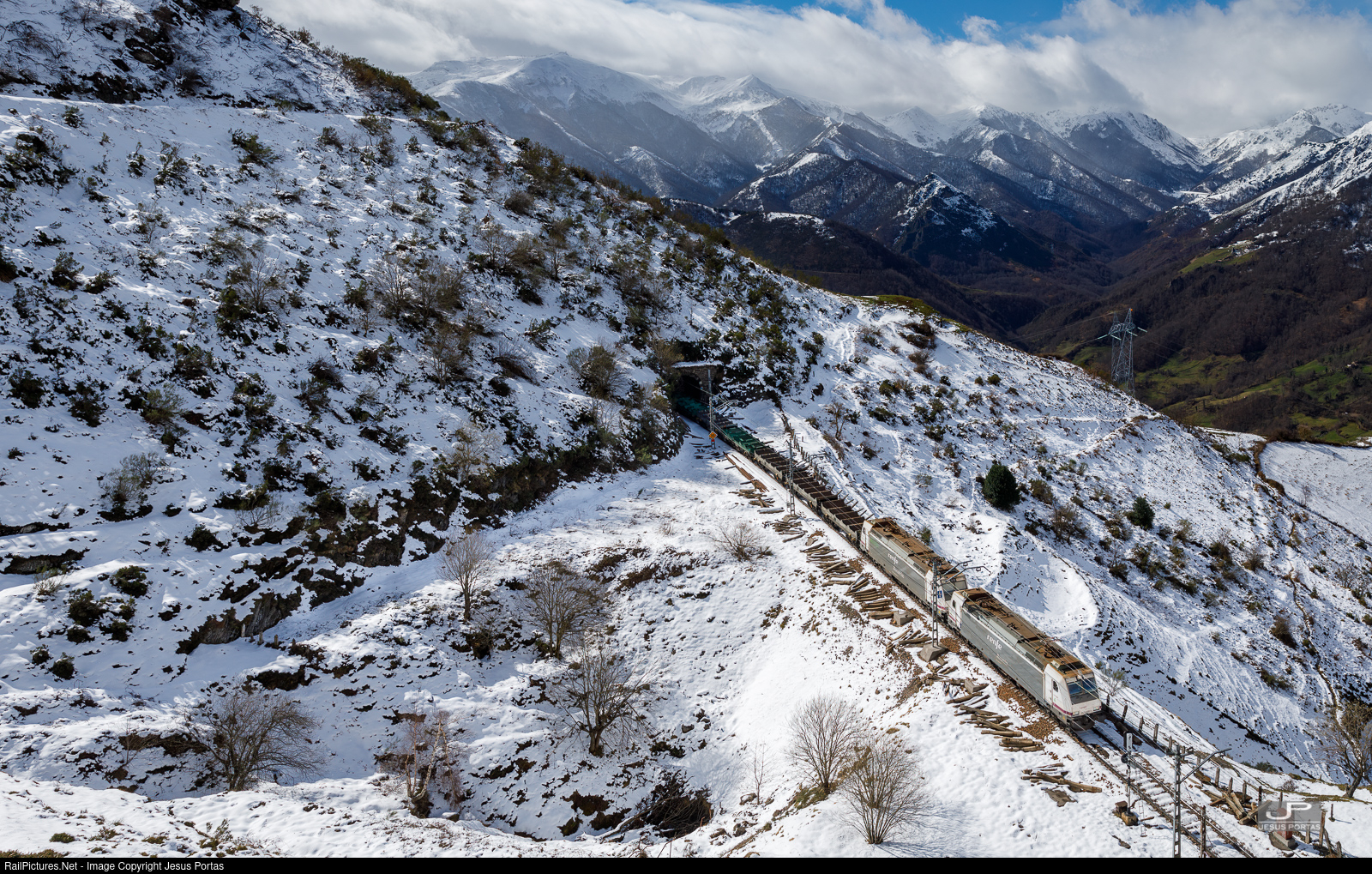renfe 253-030-1 + 253-017-8 has begun to descend Pajares Pass north face with an empty coils train.