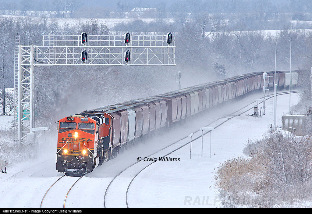 Mother Nature dump about 5-8 inches of snow overnight. The next morning roads were a 1 lane farmer's path in spots, but we made our way out and about. County roads were never plowed in this area on Saturday, so we made our way to Baring via state highways. Here an empty grain train bound for the CN at East Dubuque, IL, out of Joel, TX.