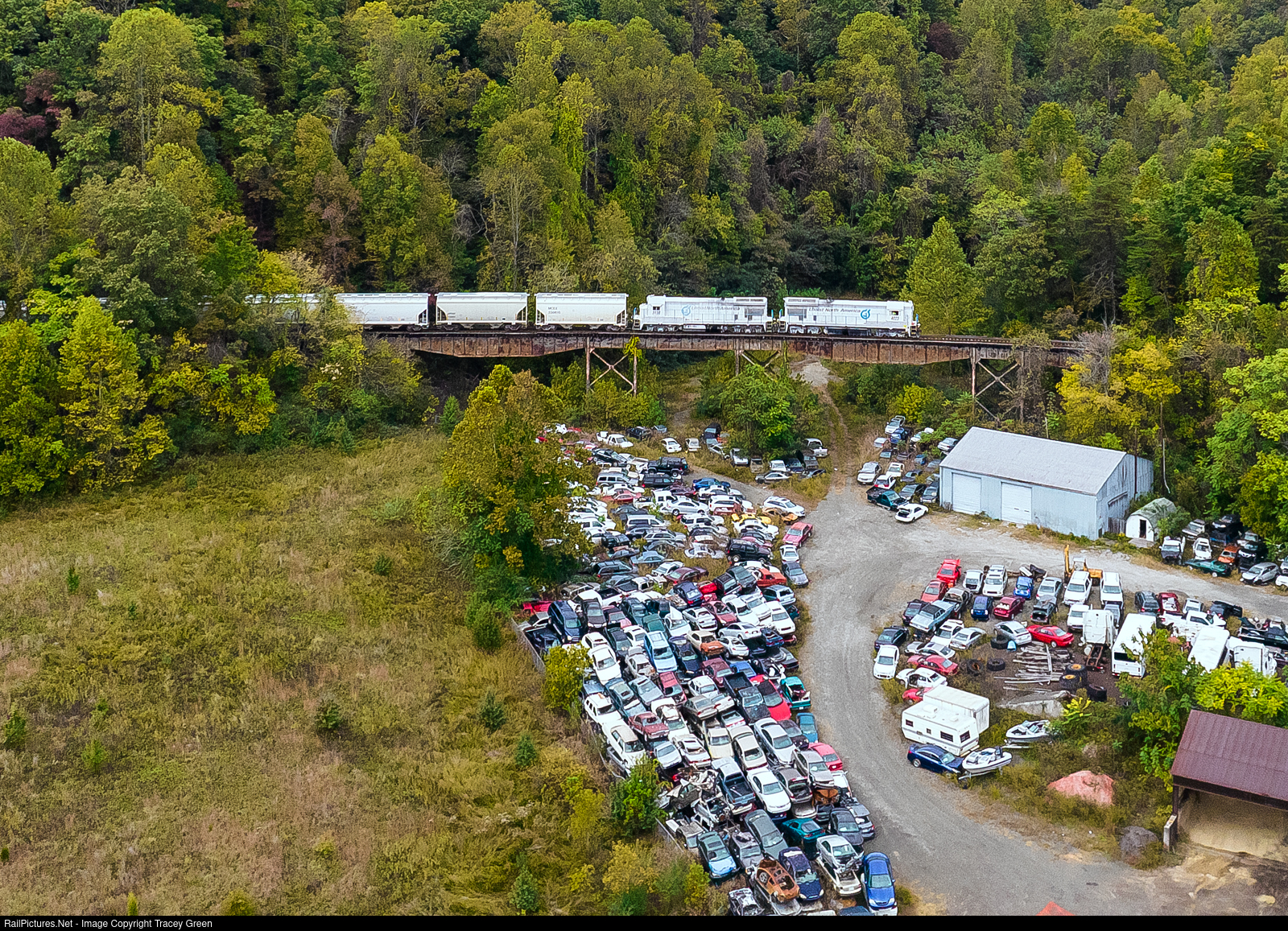 | Down by the Junk Yard. Led by a former SOU high hood GE, this Lhoist limestone train passes through Coalbank Hollow and over a fairly extensive yard full of less-than-prime automobiles. |