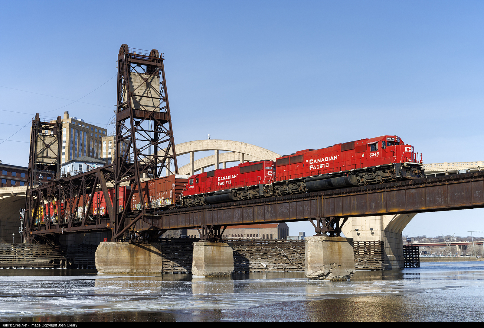 | CP H37, the Northfield, crosses the Robert Street Lift Bridge with a pair of former Soo Line SD60s for power. |