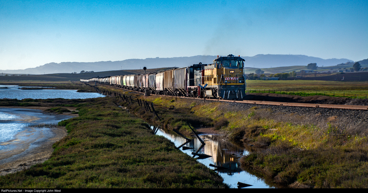 Crossing the mud flats, a 56 car train approaches Brazos heading for interchange with the Cal Northern at Lombard. The covered hoppers are empties returning from the industries near Petaluma, and the tank cars are moving out of storage at Schellville. The late afternoon lighting during winter and spring when the hills are green is magical, almost unreal. So far very little has changed since SMART took over management of the railroad on March 1. The trains are actually run by a contractor, Summit Signal Inc. of Willits, and the guys doing the work are so far the same friendly guys as before. SMART apparently has the right to the NWP name, but it is unclear what they will want to call their freight operation, hopefully it will continue to be NWP. Back in the old days SP hauled 100 car trains of lumber cars to and from the NWP interchange at Schellville via this route, this is probably about as close to one of those long trains as todays SMART/NWP is going to get. The signals are not block signals, they are approach signals to the lift bridge at Brazos.