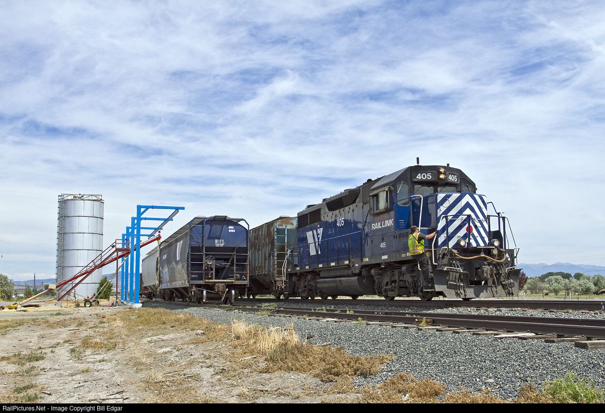 | MRL 405 handles switching chores at Three Forks, MT where the Montana Rail Link serves a talc plant and this grain loadout. This local handles business from Logan to Whitehall, MT with occasional side trips on the Harrison branch. |