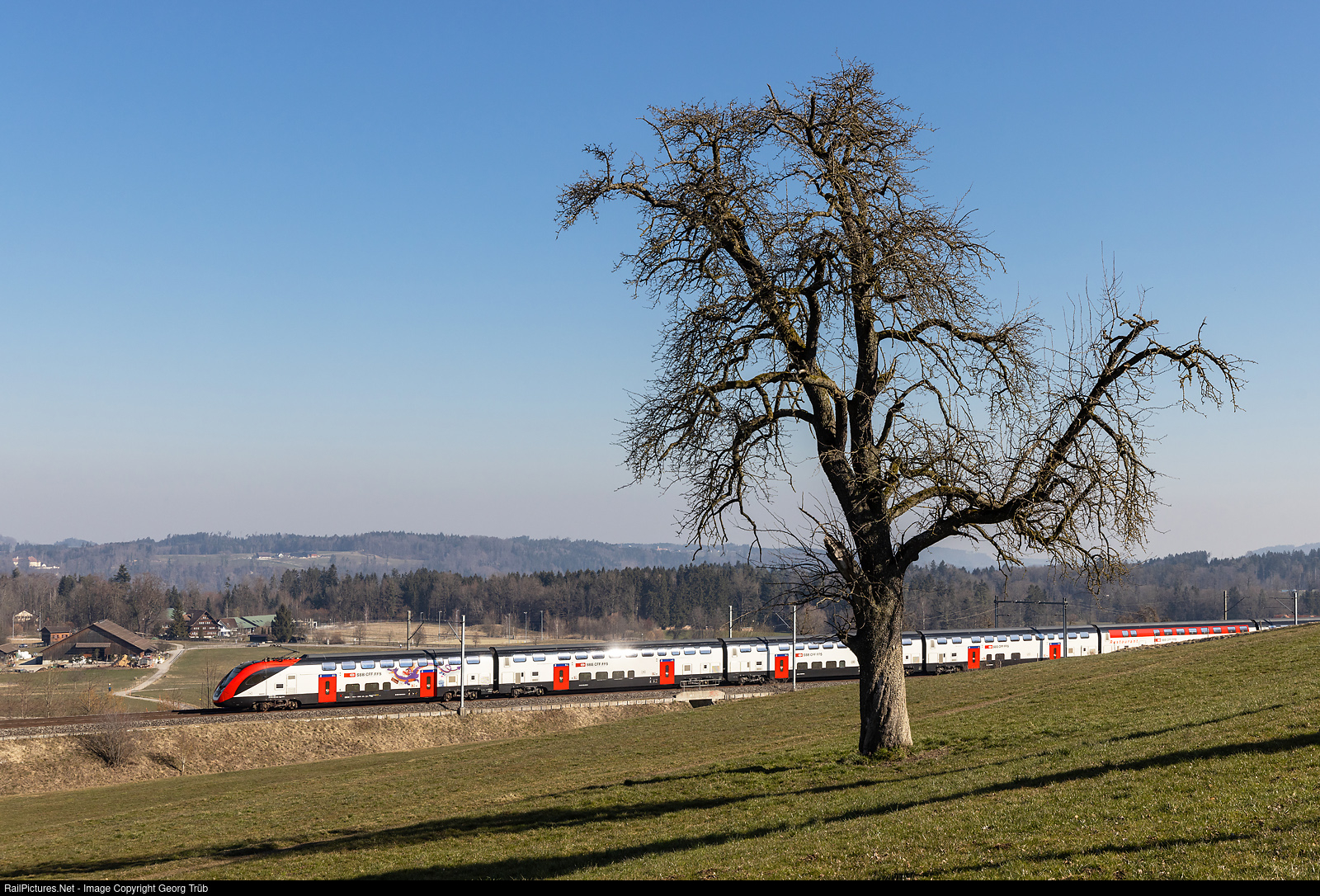 | IC 716 of the line IC 1 from St.Gallen to Geneva Airport via Winterthur-Zürich-Bern-Fribourg-Lausanne, between Flawil and Uzwil. Leading is "Aquila" RABDe 502 # 002 (IC200), coupled with not visible RABe 502 201 (IR100), forming a 400 meter train. |