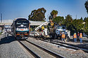 Just minutes out of the Anaheim station, Metrolink train 600 (Los Angeles to Oceanside), behind F125 938, rounds the curve at Control Point Maple as the train approaches the station in Orange. CP Maple is where SCRRA’s Orange Sub, from Fullerton to Oceanside, has a junction with the 5½-mile long Olive Sub, which begins in Atwood (a part of Placentia) and runs here to Orange. (Orange, California – March 14 ["Pi Day" … get it?], 2022)