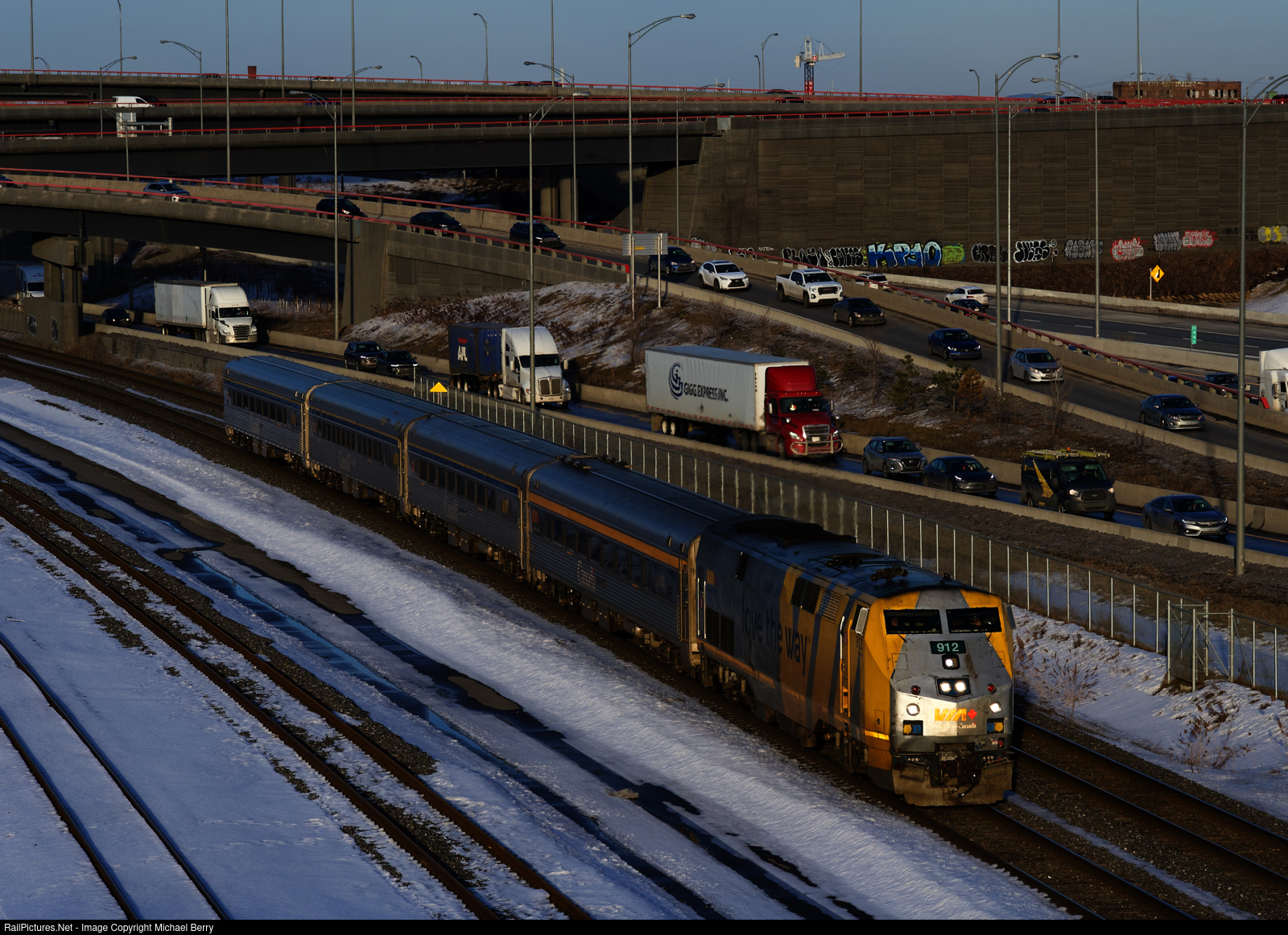 VIA 37 has VIA 912 and four HEP cars as it passes rush hour traffic during the evening rush hour.