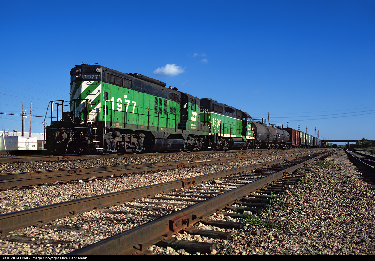 On September 17, 1994, a Burlington Northern local is about to depart Rochelle, Illinois. Leading the train is BN EMD GP9 No. 1977, a former Spokane, Portland & Seattle locomotive built by EMD in June of 1956, and is set up to operate long hood forward.