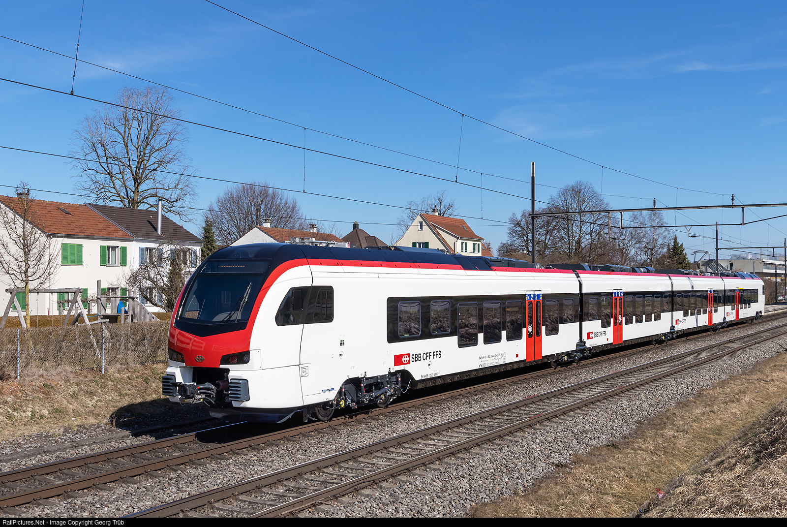 Brandnew "Mouette" (Seagull/Möwe) train RABe 523 # 504 ("Flirt 3") from StadlerRail for the SBB on a test run from Sulgen to Romanshorn, entering Amriswil. The SBB ordered 11 of this trains for Interregio services. They will run on the IR 36 "Flugzug" between Basel, Zürich and Zürich Airport in the first years, later between Basel, Delémont and Biel.