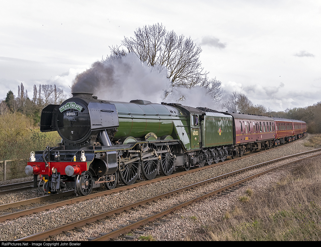 | LNER 60103 'Flying Scotsman' thunders it's 12 coach train past Hatton North Junction with the Steam Dreams 1Z51 1244 Oxford Parkway - Oxford Circular Rail tour with Class 47 47772 'Carnforth TMD' on the rear. |