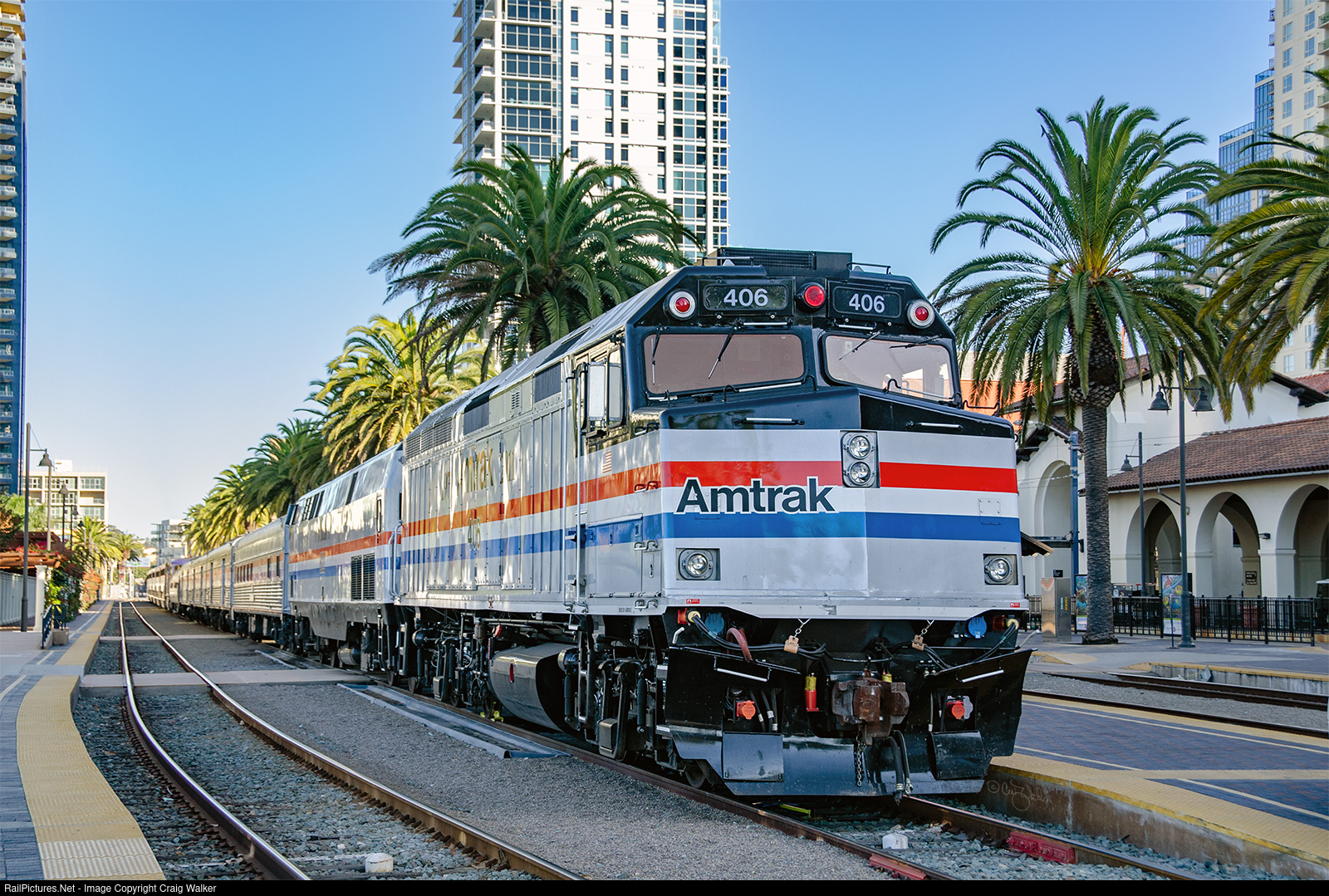| For its 40th Anniversary, Amtrak put together a display train to tour the system. This train consisted of NPCU 406 (former F40PHR 406), Dash 8-40BP 822 (one of the carrier’s engines painted in a retro scheme with 40th Anniversary markings) and cars AMTK 10020 (former 10-6 sleeper), AMTK 10093, AMTK 10094 and AMTK 10095 (three baggage cars converted to display cars), and AMTK 85999 (a former Amfleet café car converted to a gift shop). The train was on display at the former Santa Fe Railway, now Amtrak, station in San Diego, California, on December 4, 2011. |