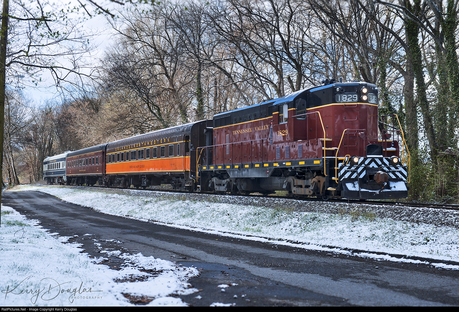 | TVRM Nº100 Missionary Ridge Local is finally underway after having the 9:30 run canceled due to a surprising winter weather that hit the Tennessee Valley the nigh before. To take safety measures the museum sent a track inspector out ahead of the train to make sure there weren’t any down trees obstructing the right or way. I think most of us would agree this scene would be very appropriate if we had either SR Nº4501 or Nº 630 and the matching maroon consist would be a great substitute than this consist. |