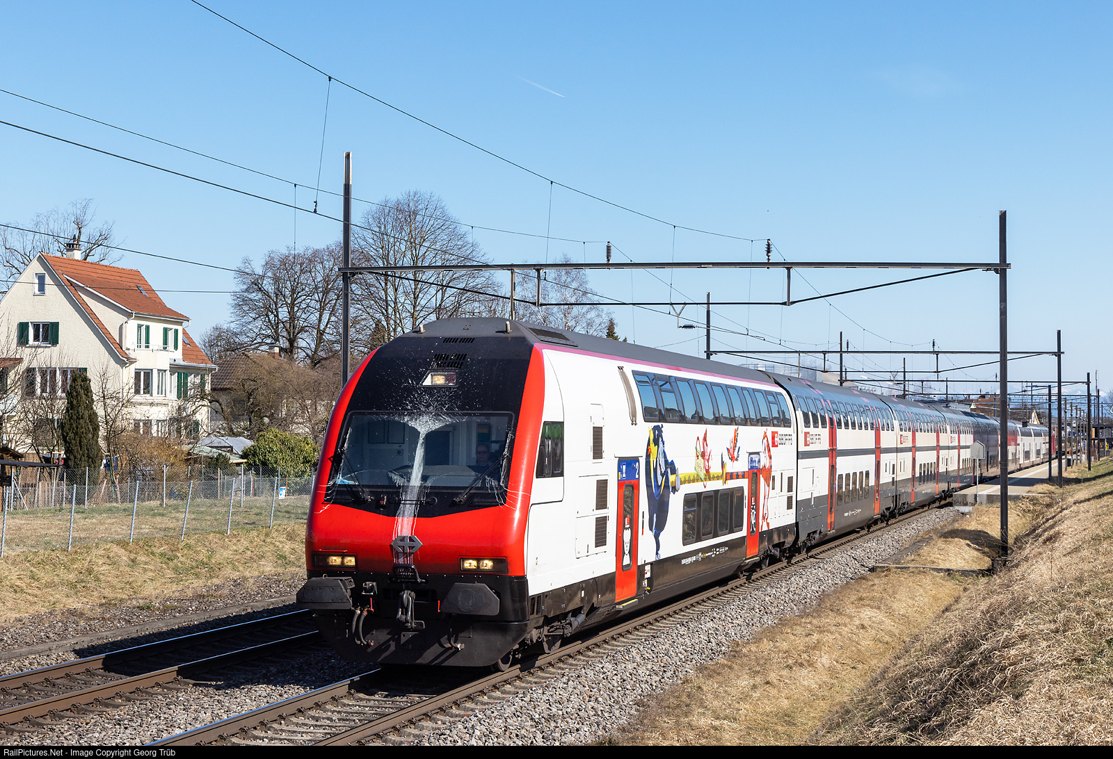 IC 822 of the line IC 8 from Romanshorn to Brig via Zürich-Bern is leaving Amriswil, with leading cab car Bt (2E) and a mix of IC2000 and refurbished IC2020 cars, and Re 460 # 081 shoving in the rear. The train driver, who had recognized me, apologized afterwards for the dirty windshield. The dirty water in the installed windshield wiper system was not suitable to remove the remains of insects on the windshield properly.