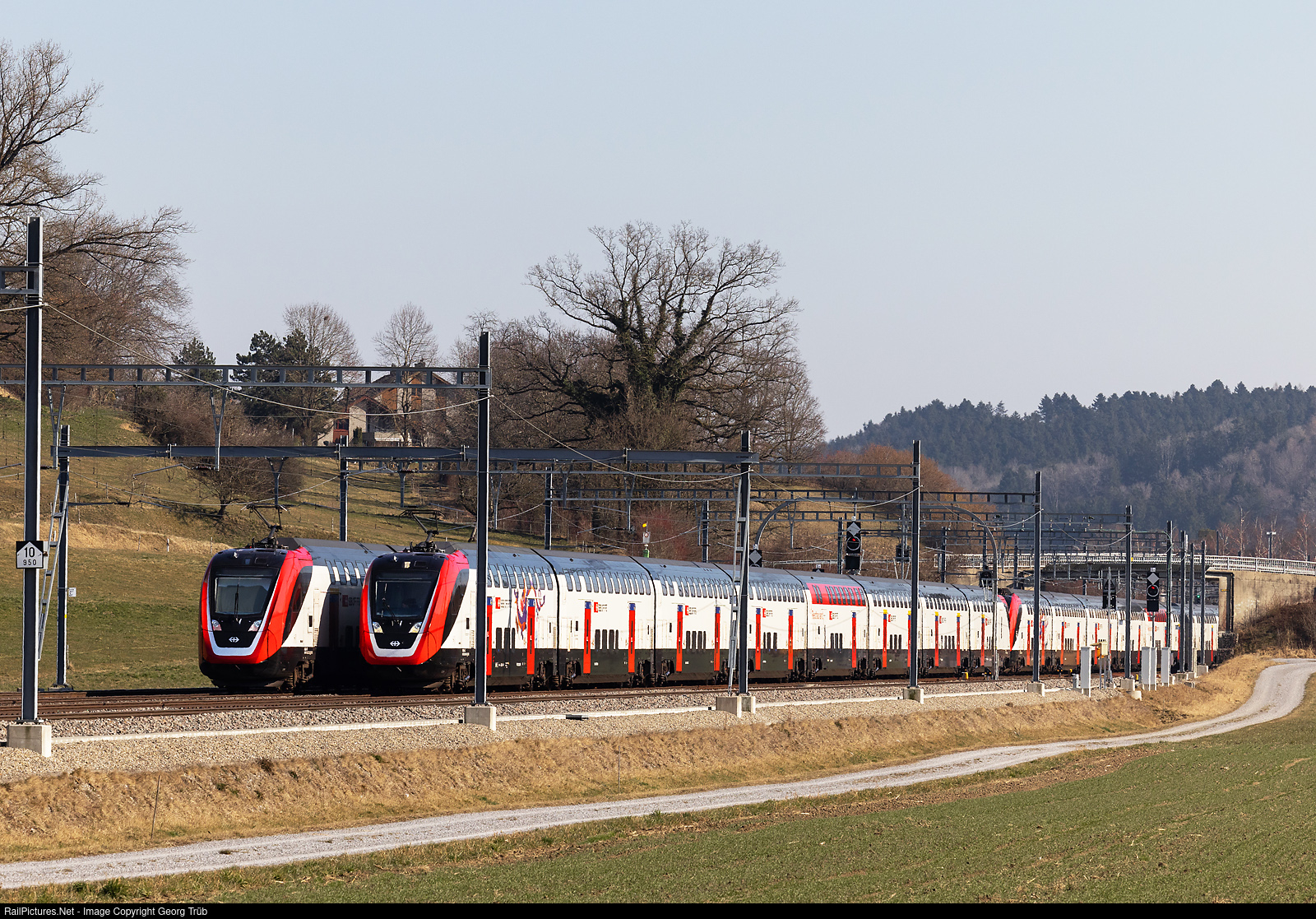 Random meeting of SBB "FVD" trains near Elgg, in the new built passing station Schneit. Coming from St.Gallen is IC 724 of the line IC 1 to Winterthur-Zürich-Bern-Fribourg-Lausanne to Geneva Airport, with RABDe 502 # 108 and # 009 (both IC200 version) in multiple control. On the other track is RABe 502 # 223, running the IR 3272 of the line IR 13 from Zürich via St.Gallen to Chur. Both trains are running at about 125 km/h.