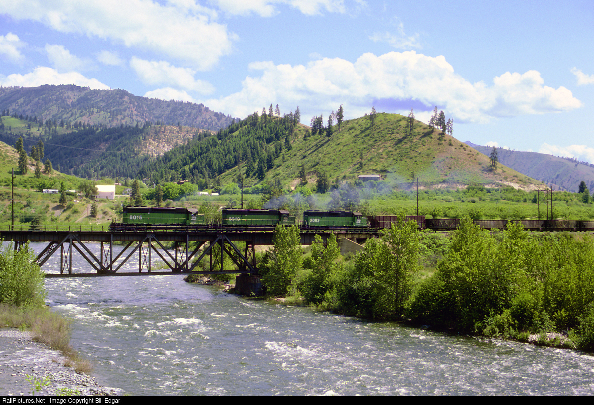 | In yet another throw back to Great Northern, a work train roll west toward Stevens Pass crossing the Wenatchee River one of three times at Dryden, WA. BN 8015 leads a long hood first elephant style consist of 2 SD40-2s and a GP38-2. The setup was likely the result of no wye being available in Wenatchee where the train originated. My guess is the crew may have wyed the lead unit at Merritt, WA about 45 miles west of Wenatchee where there is a wye for helpers and snowplows. |