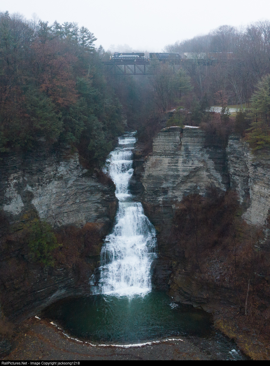 On a foggy December morning, Finger Lakes Railway train HW-2 (Himrod, NY - Watkins Glen, NY turn) creeps over the trestle spanning the Glenora Falls on its southbound run to Watkins Glen. Power for this train is a pair of FGLK's B23-7s, one of which had its side lettering removed in anticipation of relocation to FGLK's new venture in Maine. However, this never materailzed and 2310 is still working at home.