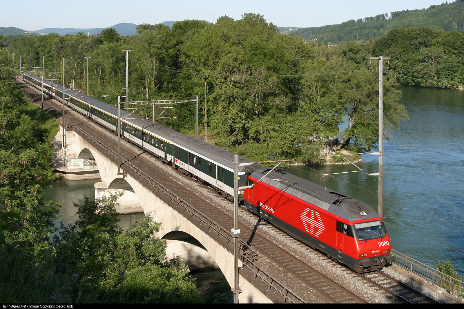Re 460 # 057 of the SBB is pulling a push-pull intercity train with standard cars of type IV over the second oldest railway bridge of Switzerland, which is still used, built in 1856, between Brugg AG and Turgi, where the Reuss flues into the Aare.