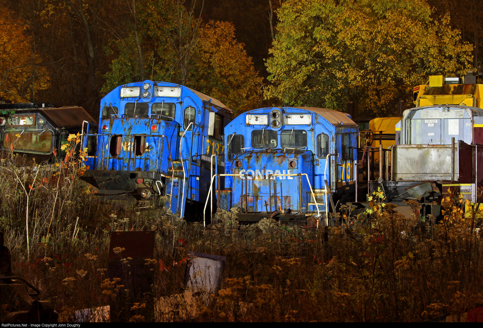 The cab of Ohio Central 7133, and two former Conrail units wearing Ohio Central numbers 7131 and 7137, spend a quiet evening at the Larry's Truck and Electric facility. These three engines were former C36-7 Conrail units, with Ohio Central reclassifying them as C30-7s. A few months after this photo was taken, the cabs were shipped to Midwest Steel and Alloy in Youngstown to be scrapped. I was granted special permission from Larry's Truck and Electric and McDonald Steel to take day and nighttime photographs on their properties, wearing all required safety gear. Don't trespass on their properties.