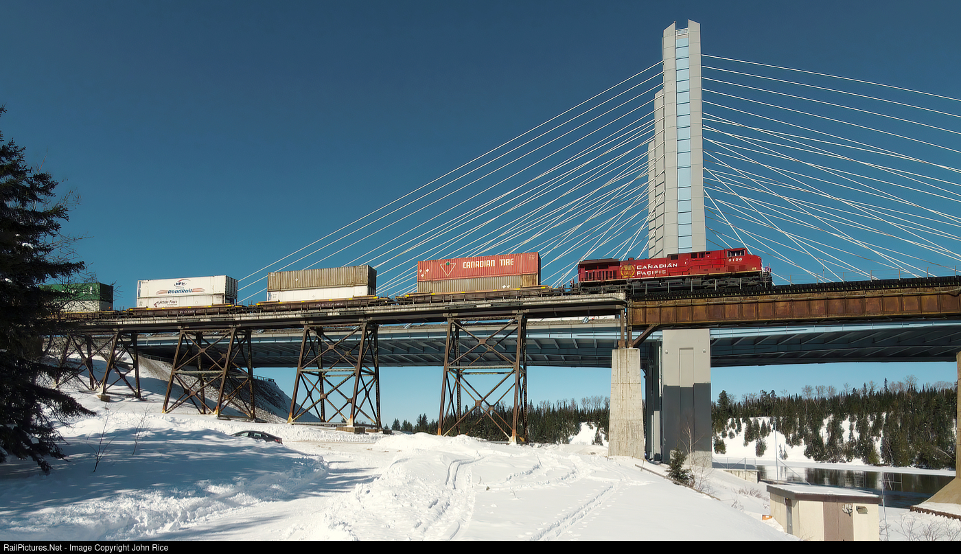 Train 100, led by rebuilt GE CP 8156, crosses the Nipigon River Bridge.