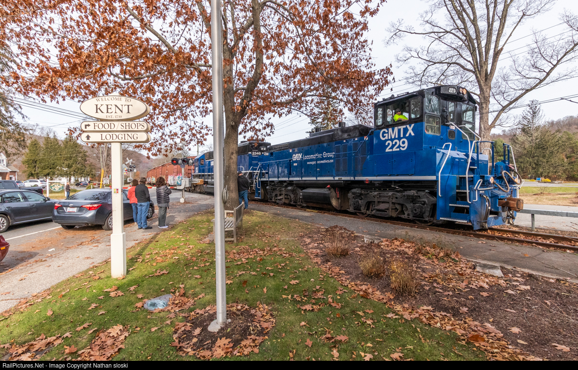 | Glass Out : NX12 Heads south through Kent, CT on a rare southbound Sunday run as a few onlookers wait for the train to pass. GMTX 229 leads in the "glass out" position followed by GMTX 2346. |