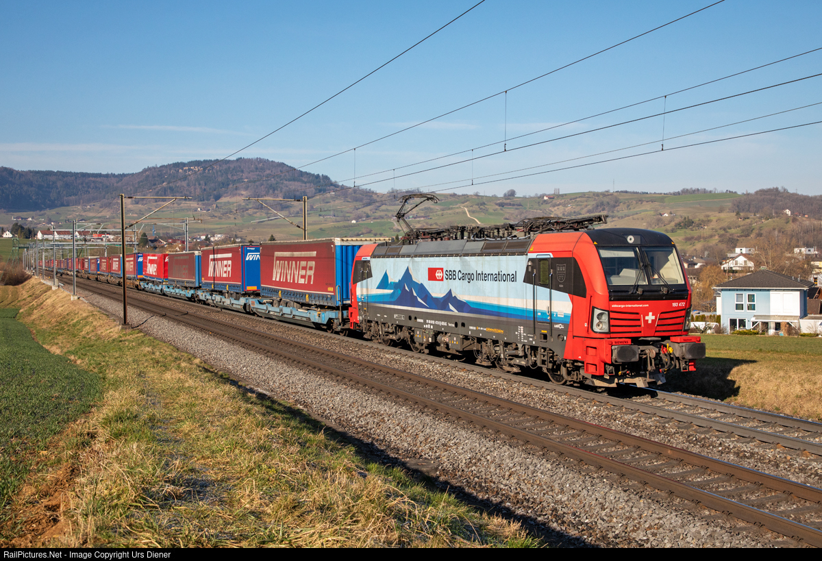 | The Siemens Vectron multisystem locomotive 193 472, delivered in 2018 to SBB Cargo International, is pulling the "Winner Spedition" intermodal train 42001 from Wuppertal Lagerfeld (Germany) to Piacenza (Italy). |