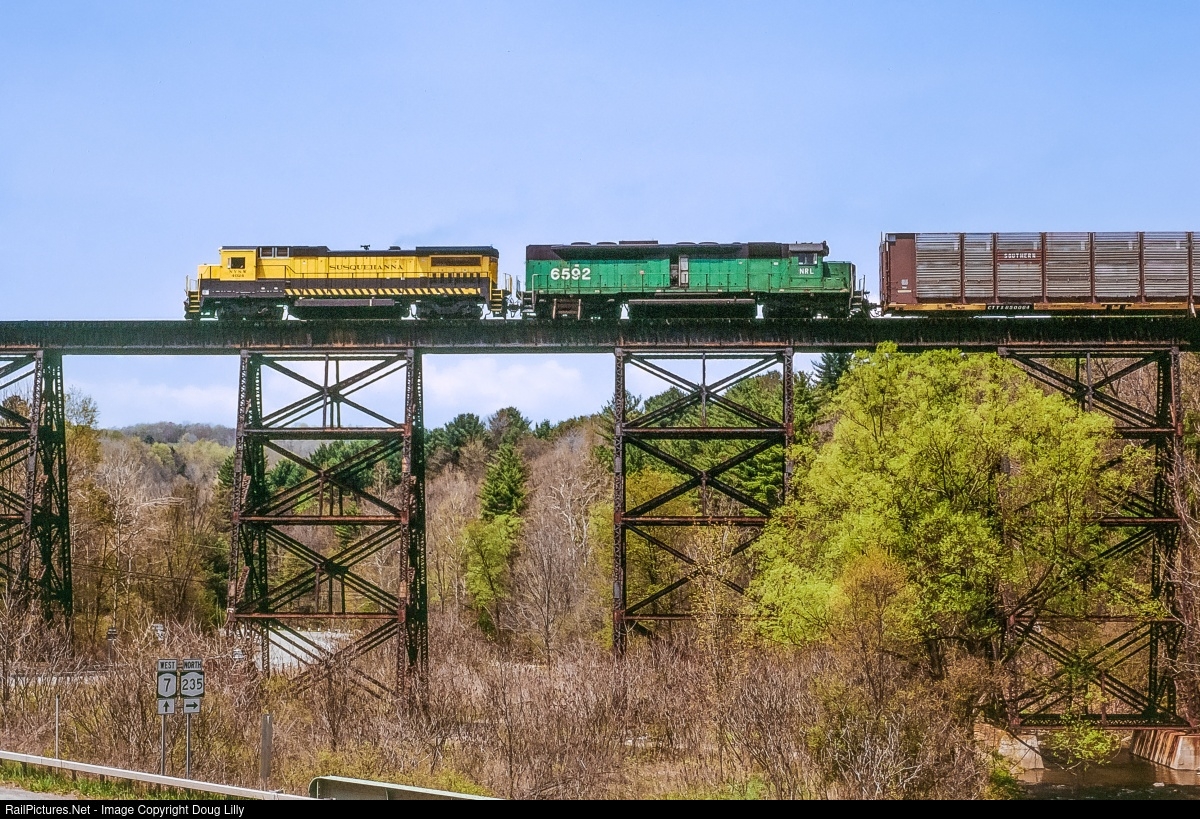 A Susquehanna B40-8 and a National Railway Leasing SDP45 lead a southbound Delaware & Hudson train over the high bridge at Harpursville, New York.