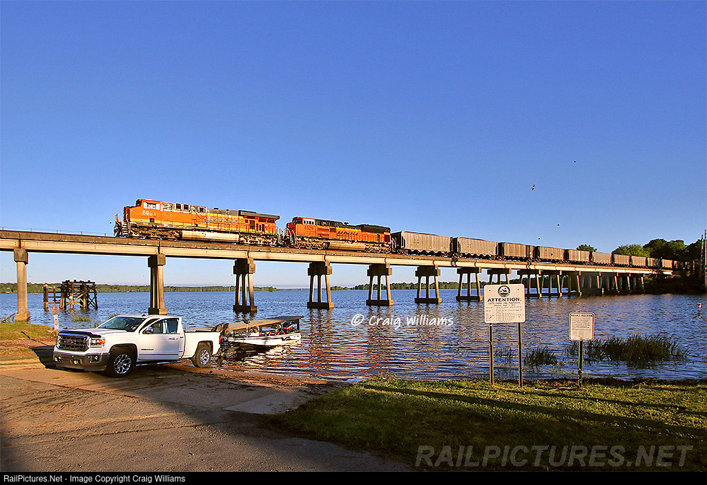 | A boater is busy getting ready to go out and enjoy the day on the Caddo Lake. He said jokingly don't let anyone at work know he was here! We have to keep it our little secret.:-) Even though I told him we were here to photograph him, really the 1st train of the day was our focus. Here a loaded Martin Lake, TX, coal train highballs across the bridge on this beautiful morning. I see why he is playing hooky! The train is on the Shreveport Terminal Sub and only 15 miles from Shreveport. We would see 3 BNSF coal trains before the end of the day. |