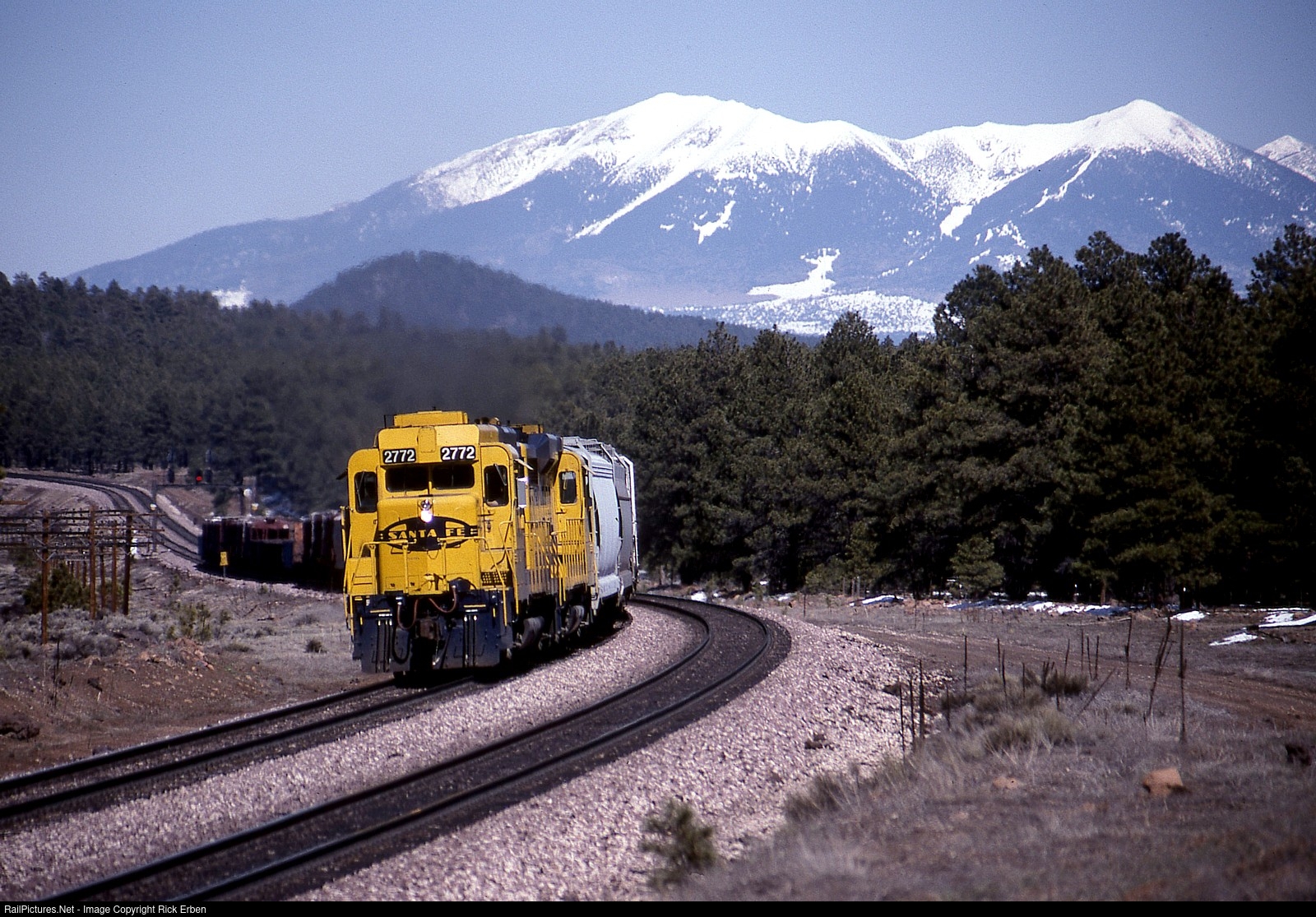 Rebuilt GP30 No. 1272, known as a GP30u, that had gone through repainting in the horrid SPSF merger scheme and was restored in proper colors leads a local freight west out of the sag between Chalender and Williams Jct. on this beautiful afternoon on the Arizona Divide.
