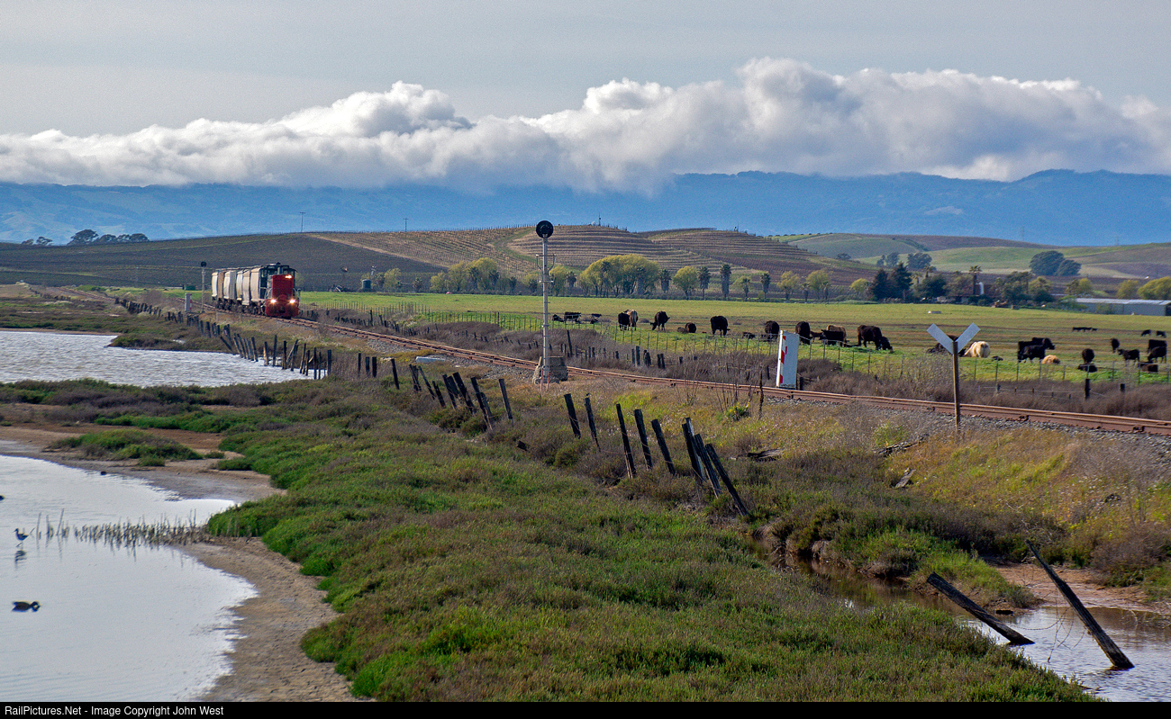 I posted another picture from this same location taken a few days earlier, and it was completely different. Here we have a short train and hazy late afternoon light, not to mention cows. The location is the west approach to Brazos bridge on the former SP branch from Suisun to Schellville, where SP interchanged with the NWP. This segment is now owned by commuter operator SMART, but only sees freight trains. Today the interchange is east of here at Lombard with the Cal Northern to connect through to the UP at Suisun.