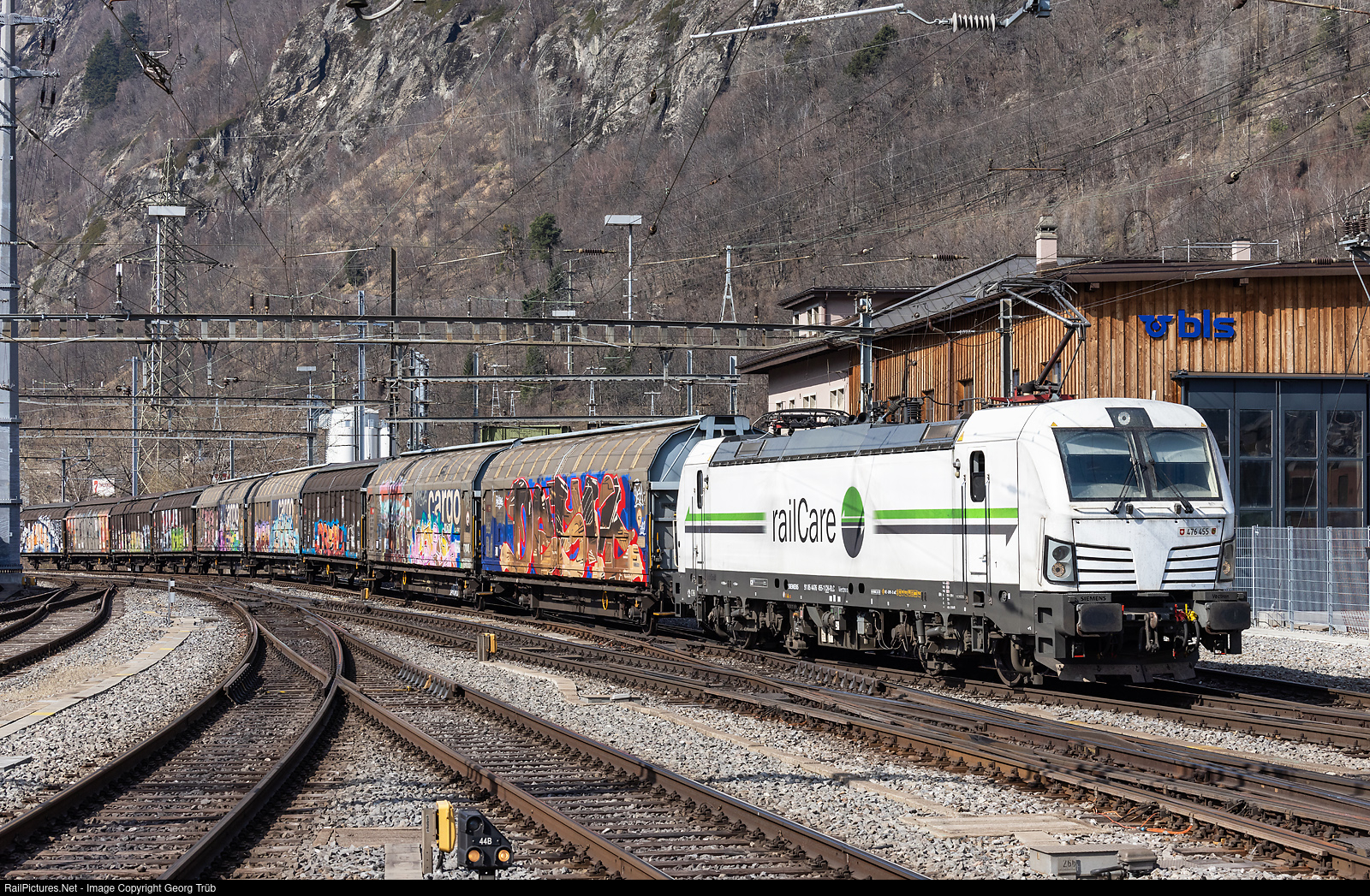 Siemens "Vectron" Rem 476 # 455 "Kanton Bern" of the Railcare is entering Brig with train 63659 from Wangen bei Olten via Solothurn-Biel Produktionsanlage Ost-Ostermundigen-Thun-Lötschberg Base Tunnel to Brig. The cars are sliding doors cars Hbbillns rented from SBB Cargo.
