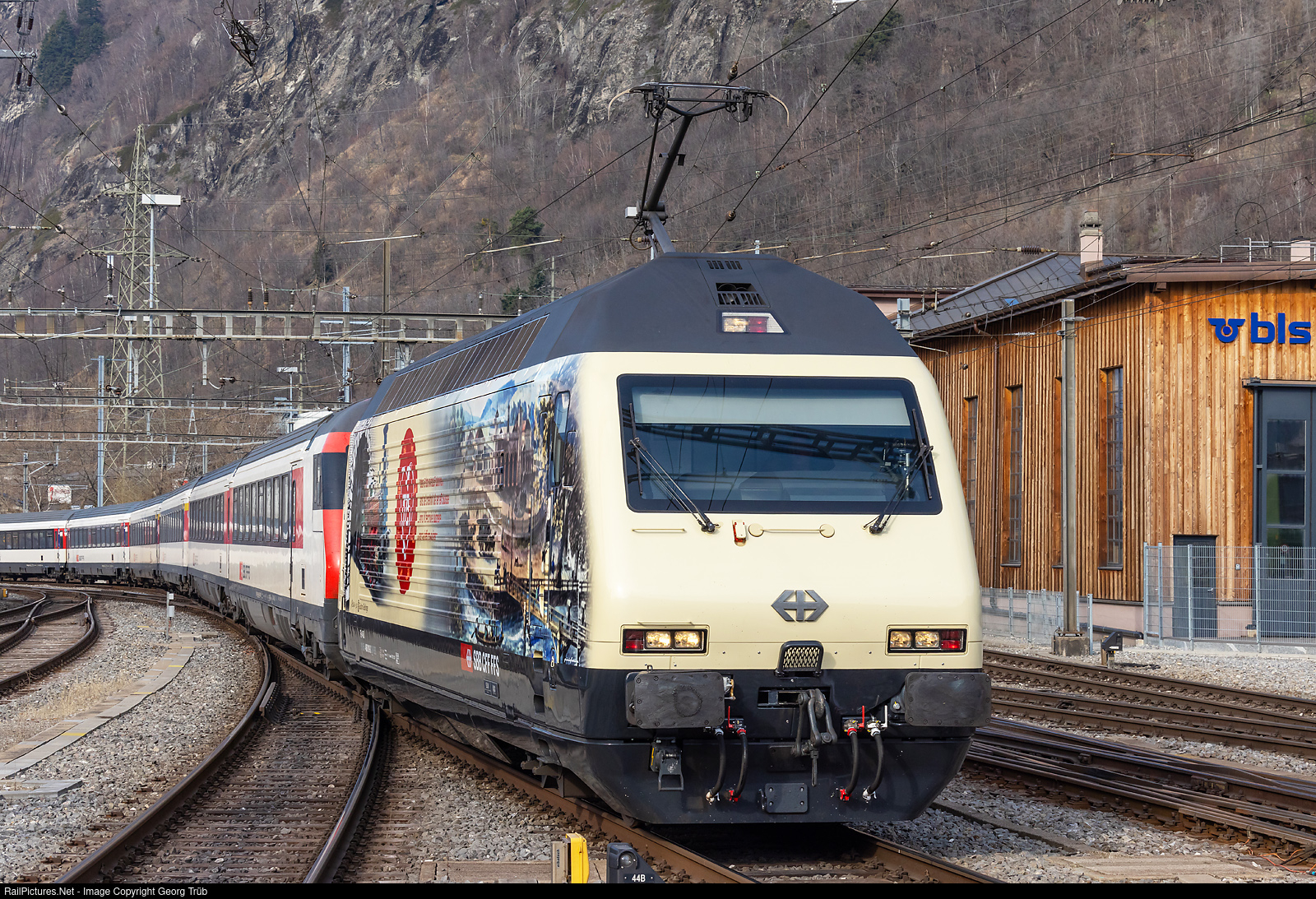 For celebrating 175 years railway in Switzerland (1847 to 2022), two locomotives with a special paint scheme (adhesives) were presented 10 days ago. The Re 460 # 019 has a picture of an "ICN" (Intercity Neigezug) tiliting train, leaving the 57 kilometer long Gotthard Base Tunnel (GBT), on one side. On this side, there is a picture of the first steamtrain, the "Spanisch Brötli Bahn" between Zürich and Baden and an old painting of the Zürich main station in the early years. The locomotive is entering Brig in front of the IR 1709 of the line IR 90 from Geneva Airport via Lausanne-Sion to Brig, a push pull train with standard cars type IV. It was the very first train, which the locomotive pulled in the new paint scheme. The locomotive has raised the front pantograph, as prescribed for the protection of the windshield of the following cab car (sparks).