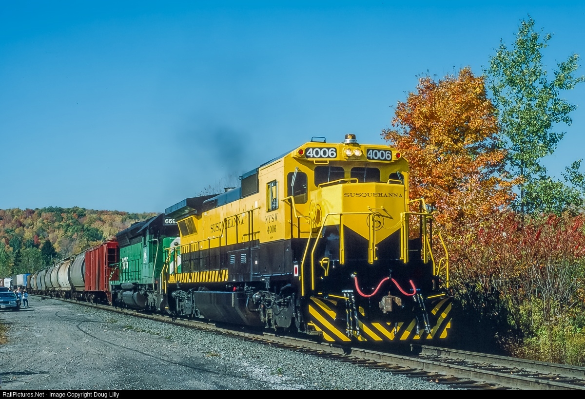 Four-month-old New-York Susquehanna & Western B40-8 4006 still looks factory-fresh leading a northbound Delaware & Hudson train approaching the Belden Hill bore at Tunnel, New York. I normally avoid foamers in my shot, but they were there first, and the fall colors were farther down the track.